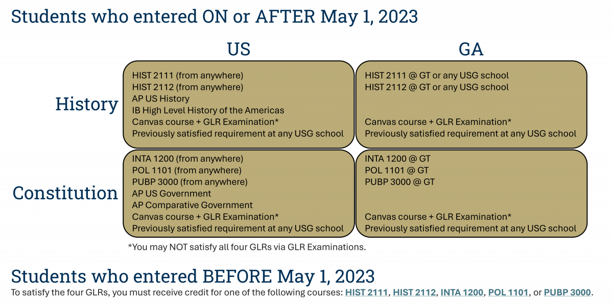 - The four Georgia Legislative Requirements (GLRs) must be completed before 90 credit hours and may be completed as follows: US HISTORY fulfilled by HIST 2111, HIST 2112, equivalent transfer/AP/IB credit, or passing the United States History Module Examination*; GA HISTORY fulfilled by HIST 2111, HIST 2112, equivalent transfer/AP/IB credit, or passing the Georgia History Module Examination; US CONSTITUTION fulfilled by INTA 1200, POL 1101, PUBP 3000, equivalent transfer/AP/IB credit, equivalent transfer/AP/IB credit, or passing the United States Constitution Module Examination*; GA CONSTITUTION fulfilled by INTA 1200, POL 1101, PUBP 3000, equivalent transfer/AP/IB credit, equivalent transfer/AP/IB credit, or passing the Georgia Constitution Module Examination*. Note that all students must complete one of these five courses (HIST 2111, HIST 2112, INTA 1200, POL 1101, or PUBP 3000) to fulfill the Political Science & US History requirement; courses may be completed at GT or via AP/IB/Transfer credit. *Note that the Module Examinations do not carry any academic credit.